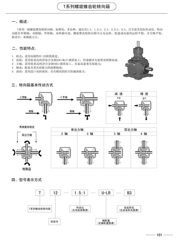 T系列一級轉向箱,標準化,多品種,速比1∶1、1.5∶1、2.5∶1、3∶1、4∶1、5∶1全部為實際傳動比。平均效率98%。