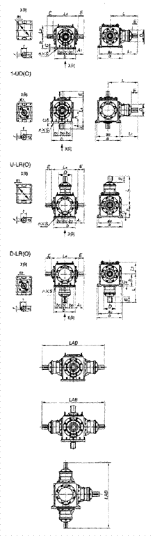 T系列螺旋錐齒輪傳動箱軸配置及軸旋轉方向的關系、安裝方位及尺寸表
