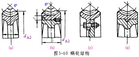 蝸輪常見的結構有整體式和組合式兩種。鑄鐵蝸輪和小尺寸的青銅蝸輪常采用整體式結構[圖3-60(a)]。尺寸較大時,為節省貴金屬多采用組合式,齒圈(輪緣)用青銅,而輪芯用鋼或鑄鐵。它們的組合方式有:過盈配合加緊定螺釘[圖3-60(b)];用絞制孔加螺栓聯接[圖3-60(c)];鑲鑄式,即將青銅齒圈澆鑄在鑄鐵輪芯上[圖3-60(d)]。