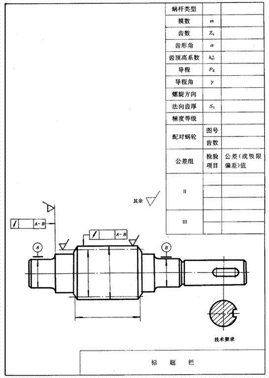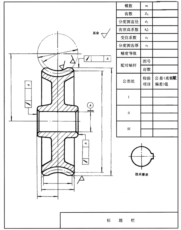 蝸桿、蝸輪圖樣的繪制應符合GB4459.2的規定。圖樣中的參數表一般放置于圖面的右上方,參數表中列出的數據項目可根據需要增減,檢驗項目則按使用要求和用戶意見根據GB10089和有關標準的規定確定。圖樣的技術要求一般放置于圖面的右下方。